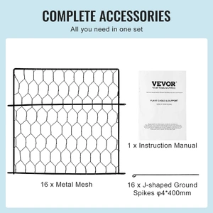 Our plant cages for outdoor plants include 16 pcs of metal mesh, 16 pcs J-shaped Ground Spikes(φ4*400mm), and 1 instruction manual. Each component is finely forged for long-term use.