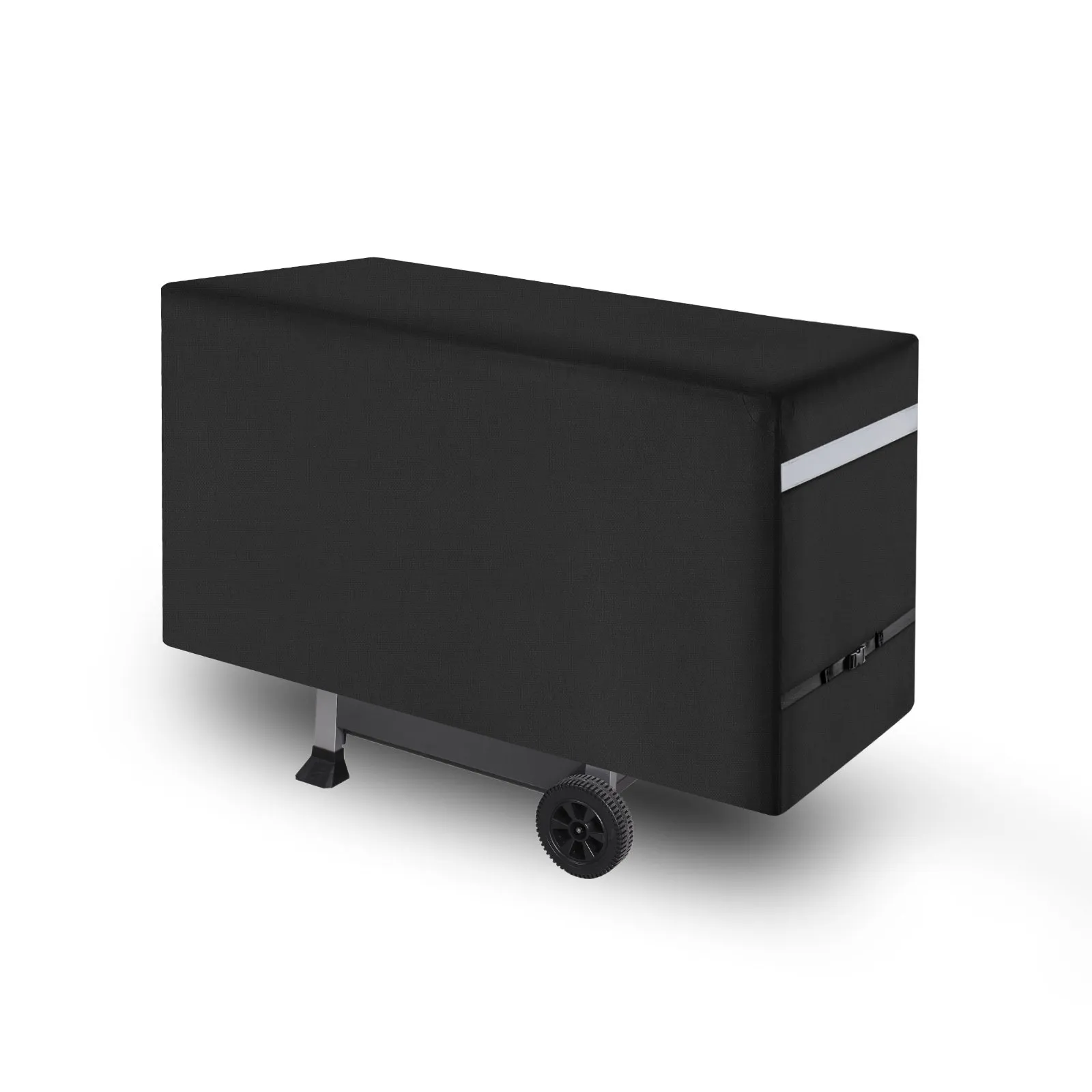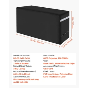 The grill cover is made from 600D heavy-duty polyester fabric, featuring an abrasion-resistant polyester fiber layer. The four corners are reinforced to enhance tear resistance and durability. Strong and reliable, this cover effectively withstands rain, snow, and harsh weather conditions
