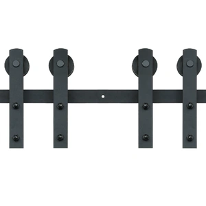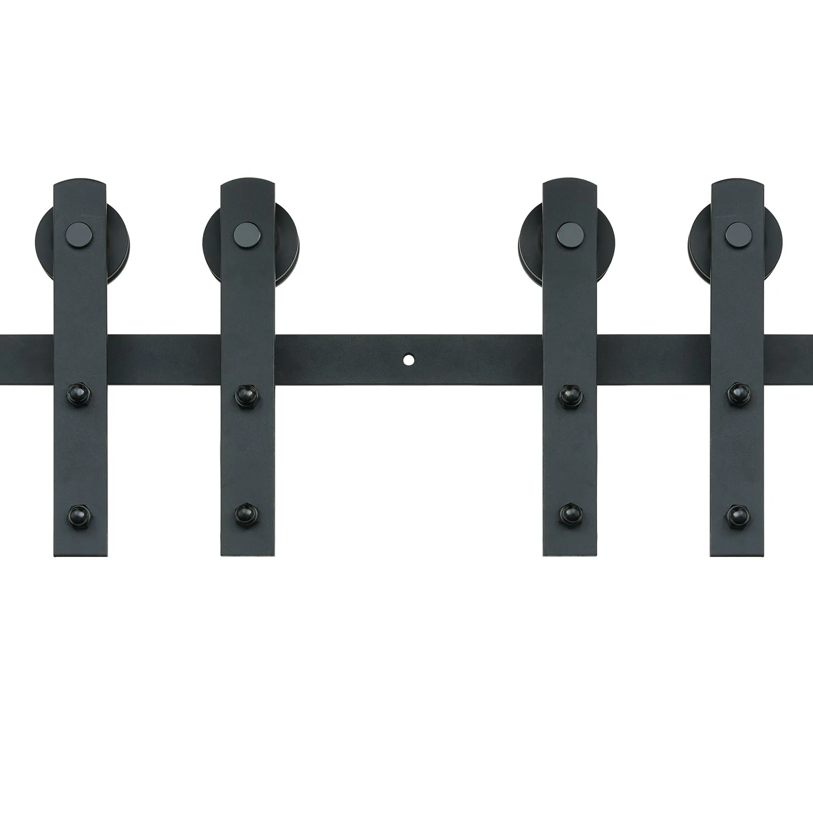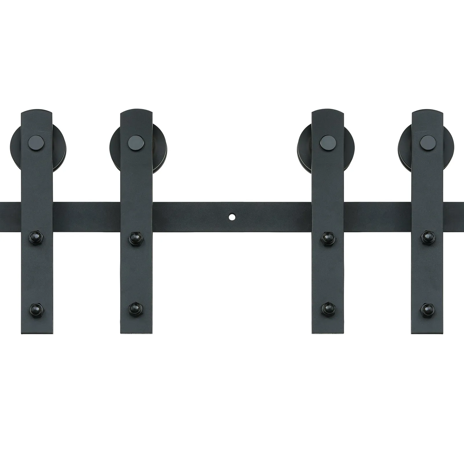 Our sliding barn door hardware is made of solid carbon steel with fine black powder coated surface. It delivers excellent anti-corrosion performance for years of attractiveness and durability. This 8ft barn door track and hardware kit is suitable for double doors up to 4.3FT wide (2 doors total width) and weighing up to 330lbs, perfect for most doors. Fit Double Doors Total Width: 3.7-4.3FT; Fit Door Thickness: 1.3 "-1.8".