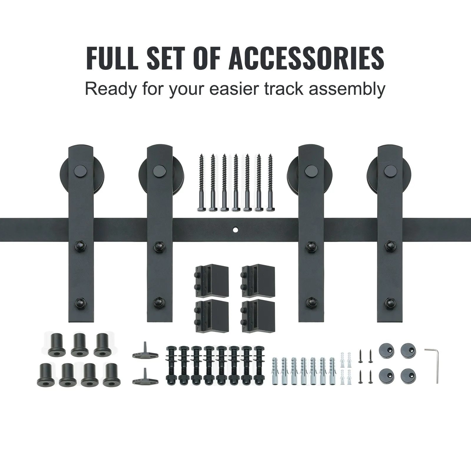 VEVOR 8ft I-shaped sliding barn door hardware kit comes with 2-section tracks, making the assembly exceptionally simpler and safer. This heavy duty barn door hardware kit can easily hold up the barn door track without shaking, while the low clearance barn door hardware system requires less space above the doorway, both stable and space-saving!