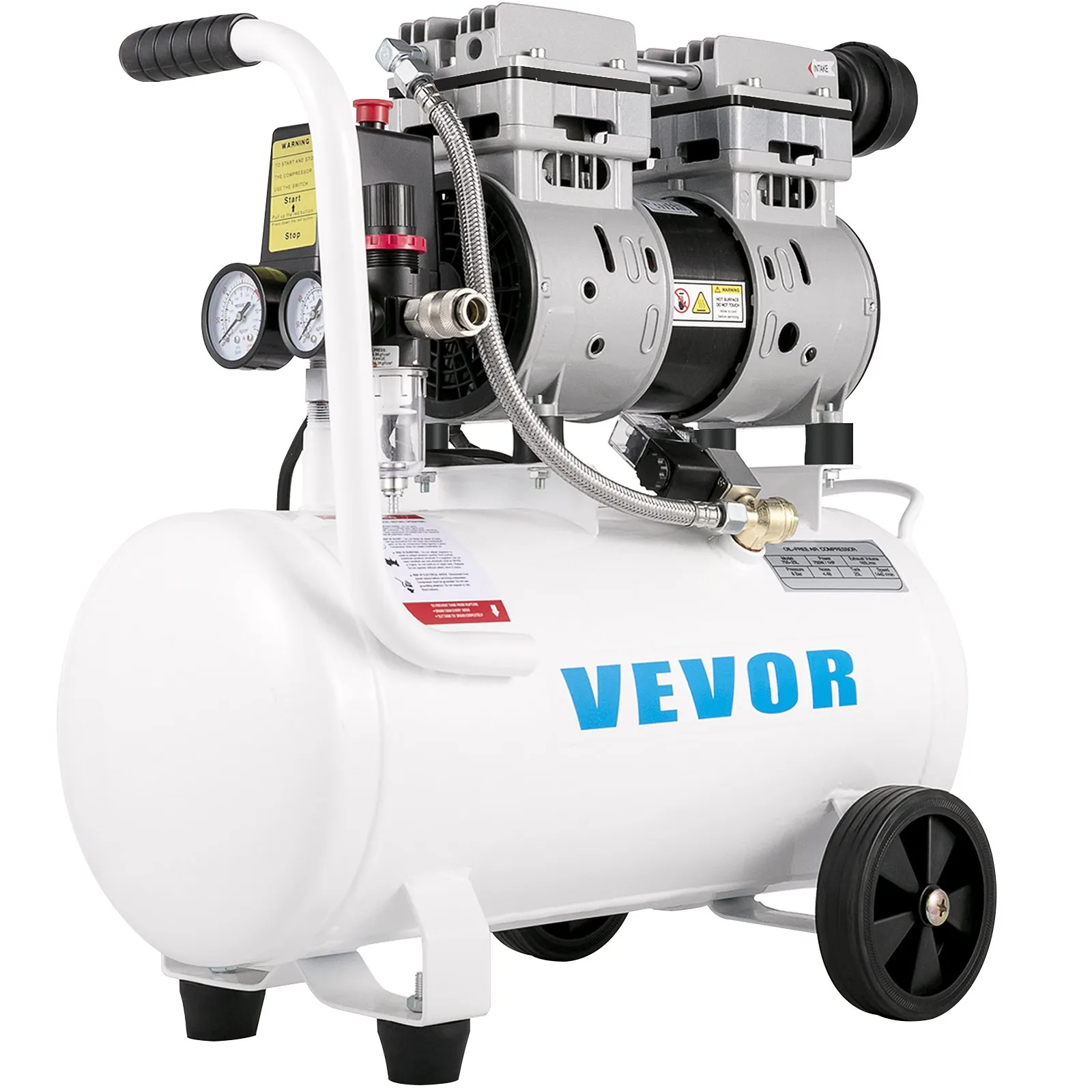 The air compressor is equipped with an oilless pump for minimal maintenance and a 25 L tank for continuous and high-efficiency operation.
