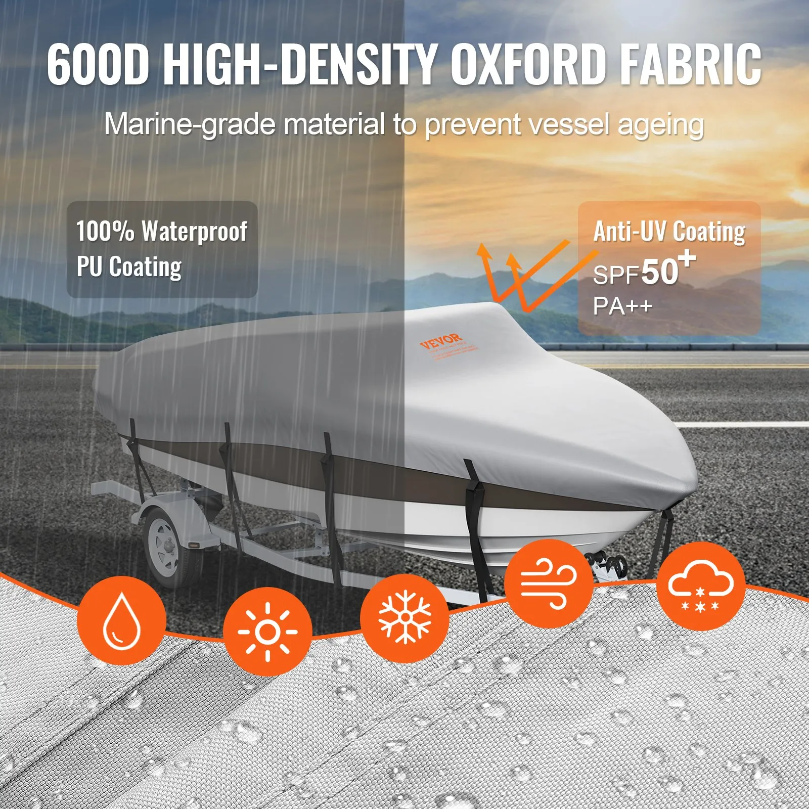 Crafted from heavy-duty 600D Oxford cloth, our trailerable boat cover resists wear and tear. It features a dual-layer PU coating for enhanced waterproofing and UV protection, effectively shielding against corrosion and sun damage. The high-density cloth prevents water infiltration, keeping your boat dry, especially in marine environments.