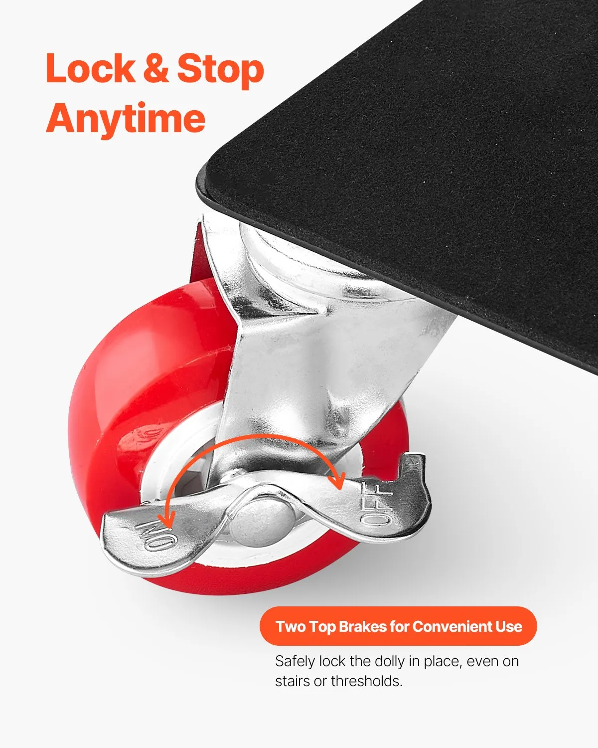 Equipped with dual brakes, a simple push locks the heavy duty furniture dolly in place, avoiding unintended movement. This ensures security during transport and while parked, allowing you to temporarily set down furniture to open doors or retrieve other items.