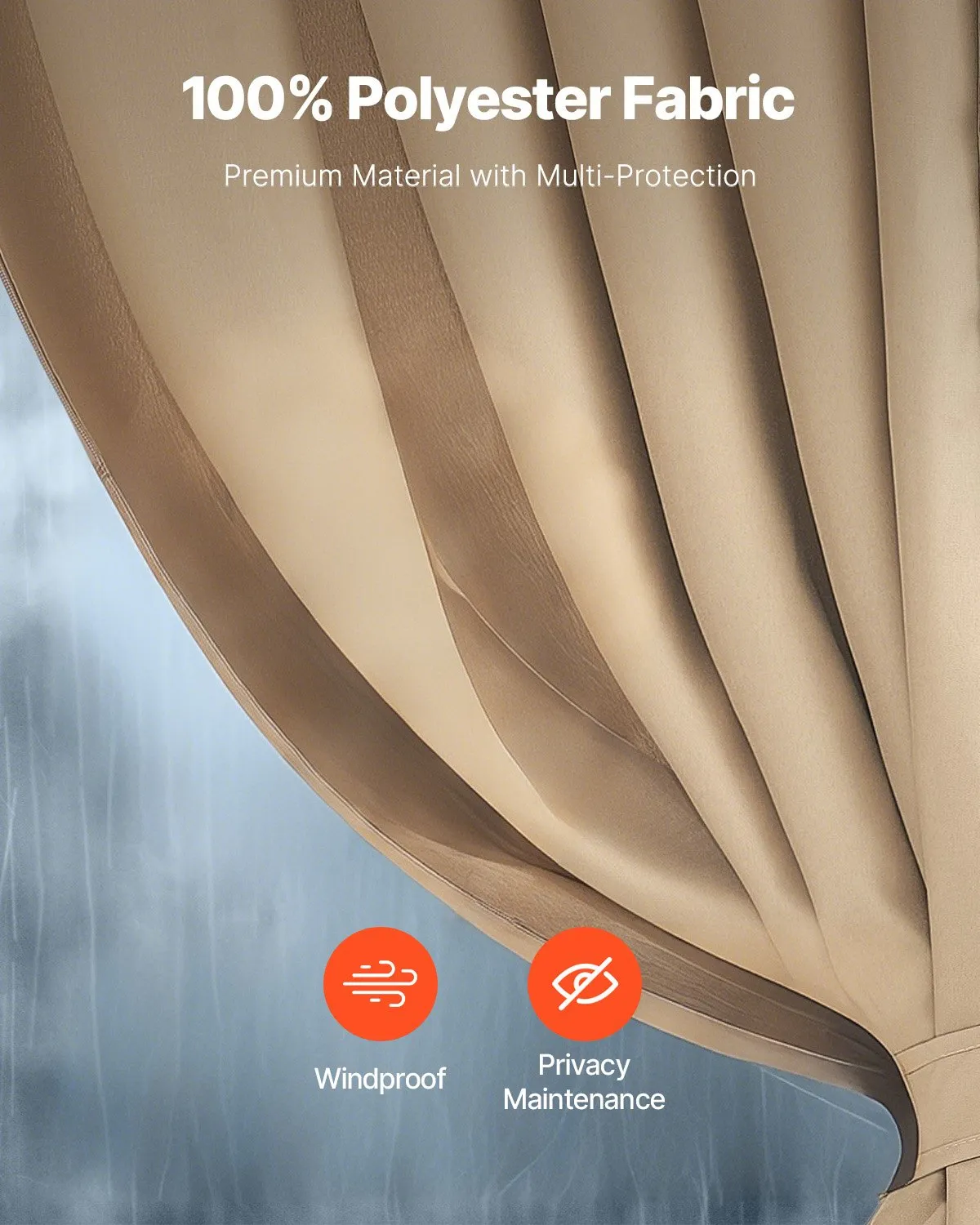 Crafted from 160gsm quality waterproof polyester, this gazebo privacy curtain provides excellent waterproofing, sun protection, and wind resistance, making it ideal for outdoor use. It protects against harsh weather while effectively maintaining your privacy for comfort and safety outdoors.