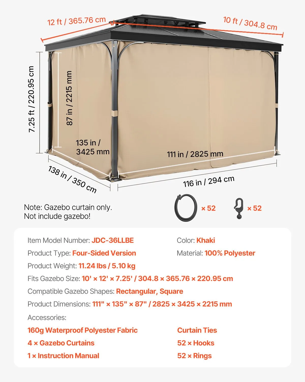 This gazebo privacy replacement curtain is designed for 10' x 12' x 7.25' gazebos, made from 100% polyester for outstanding durability and sun protection. The double-sided zipper allows for easy adjustments from both inside and outside, making installation quick and creating a comfortable, private outdoor space.