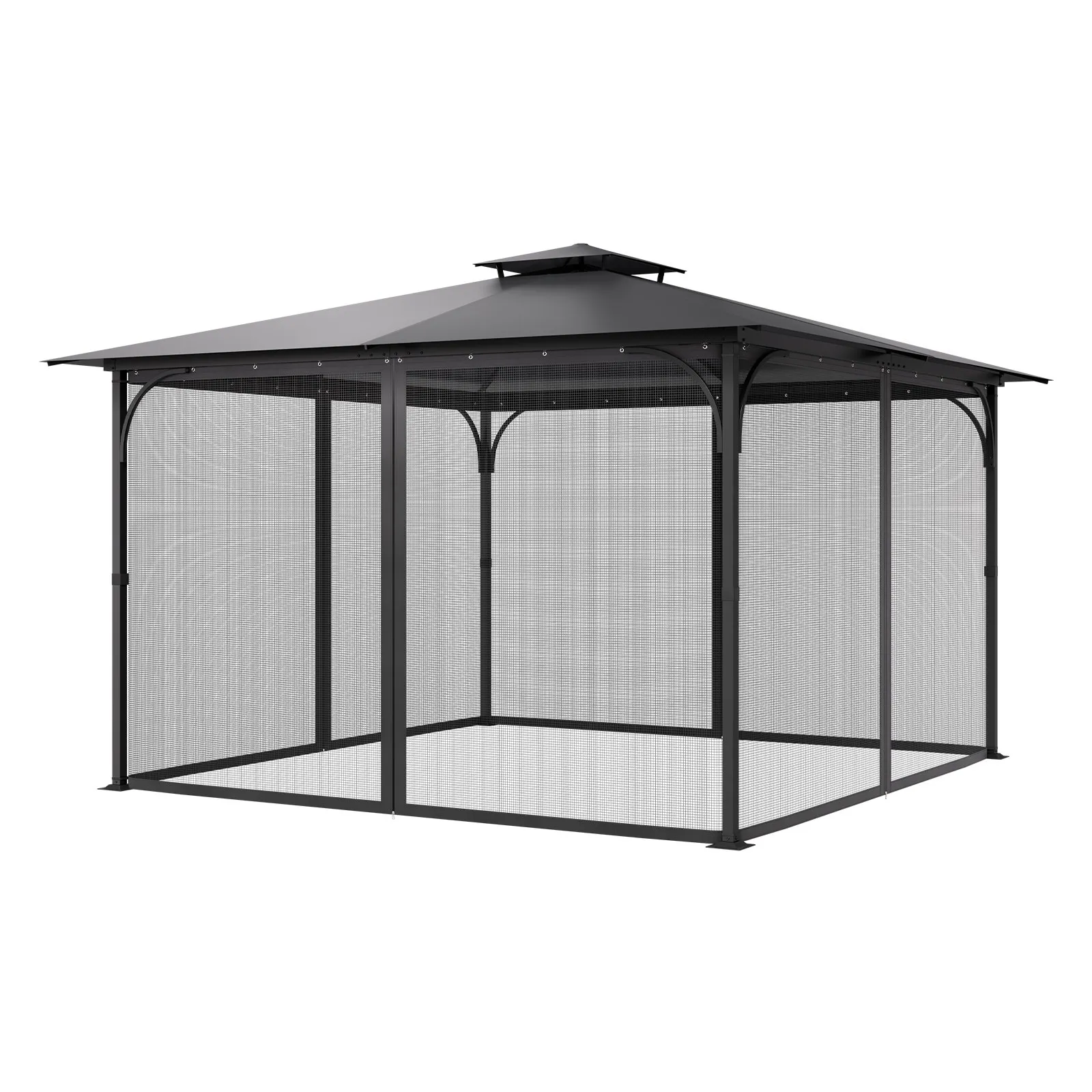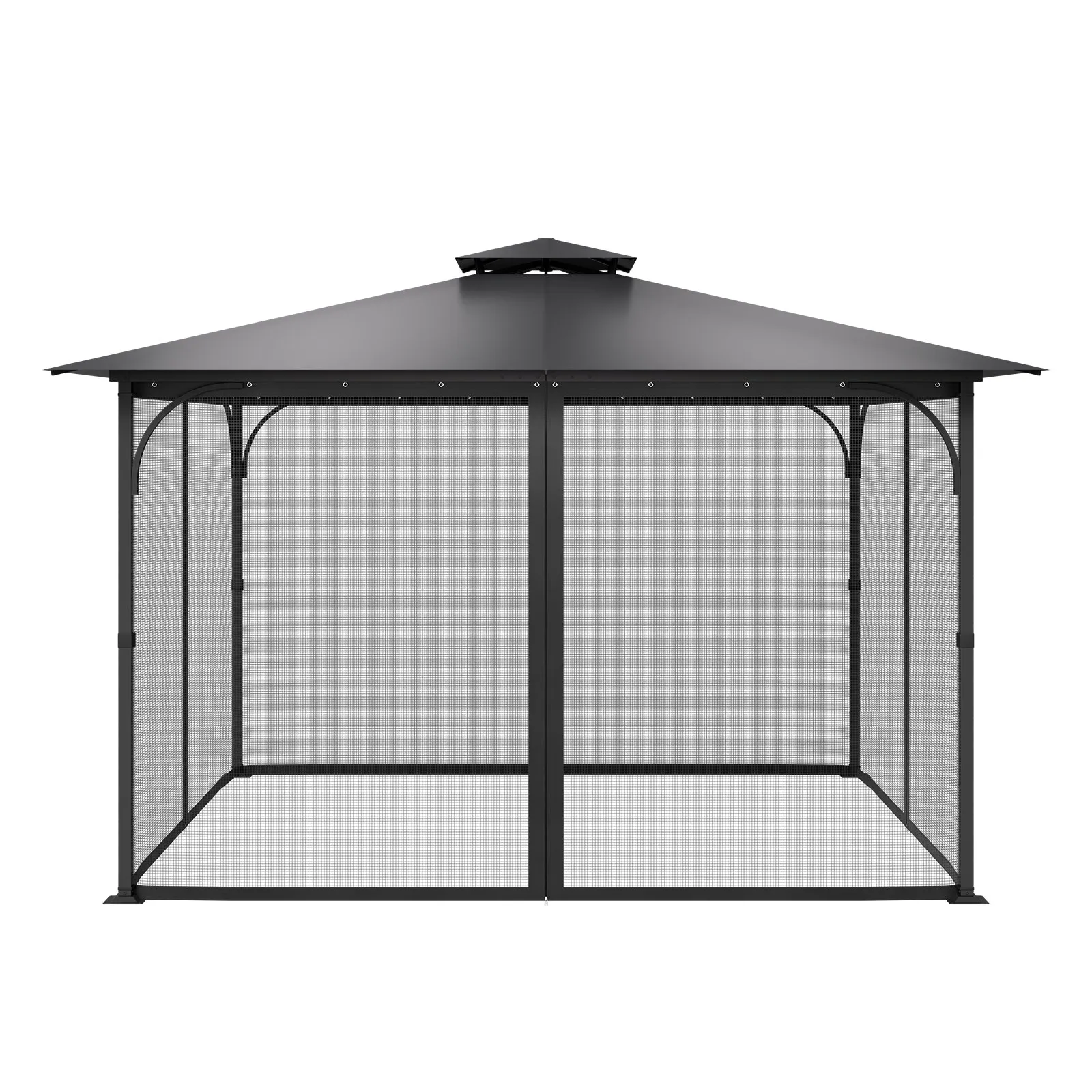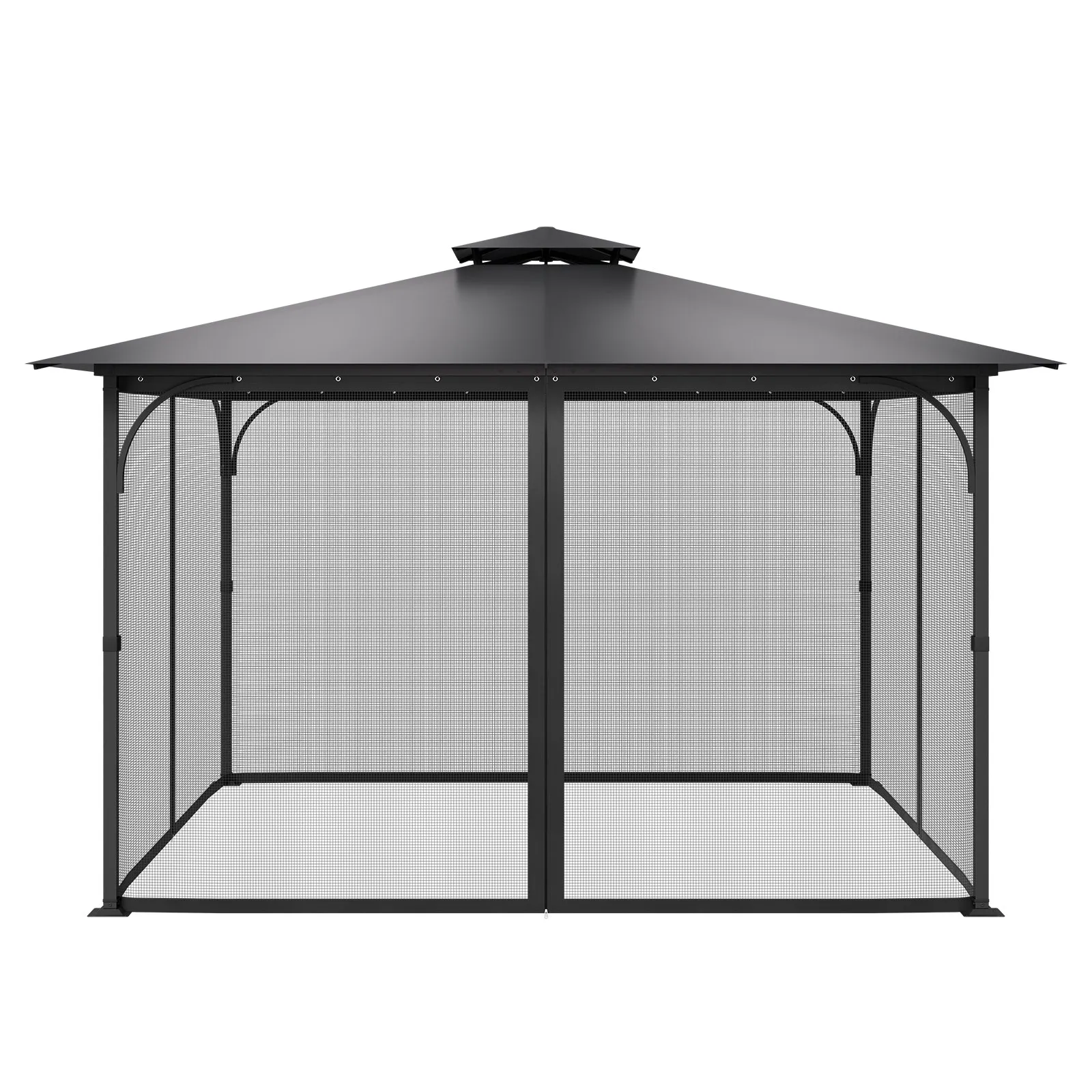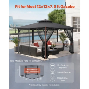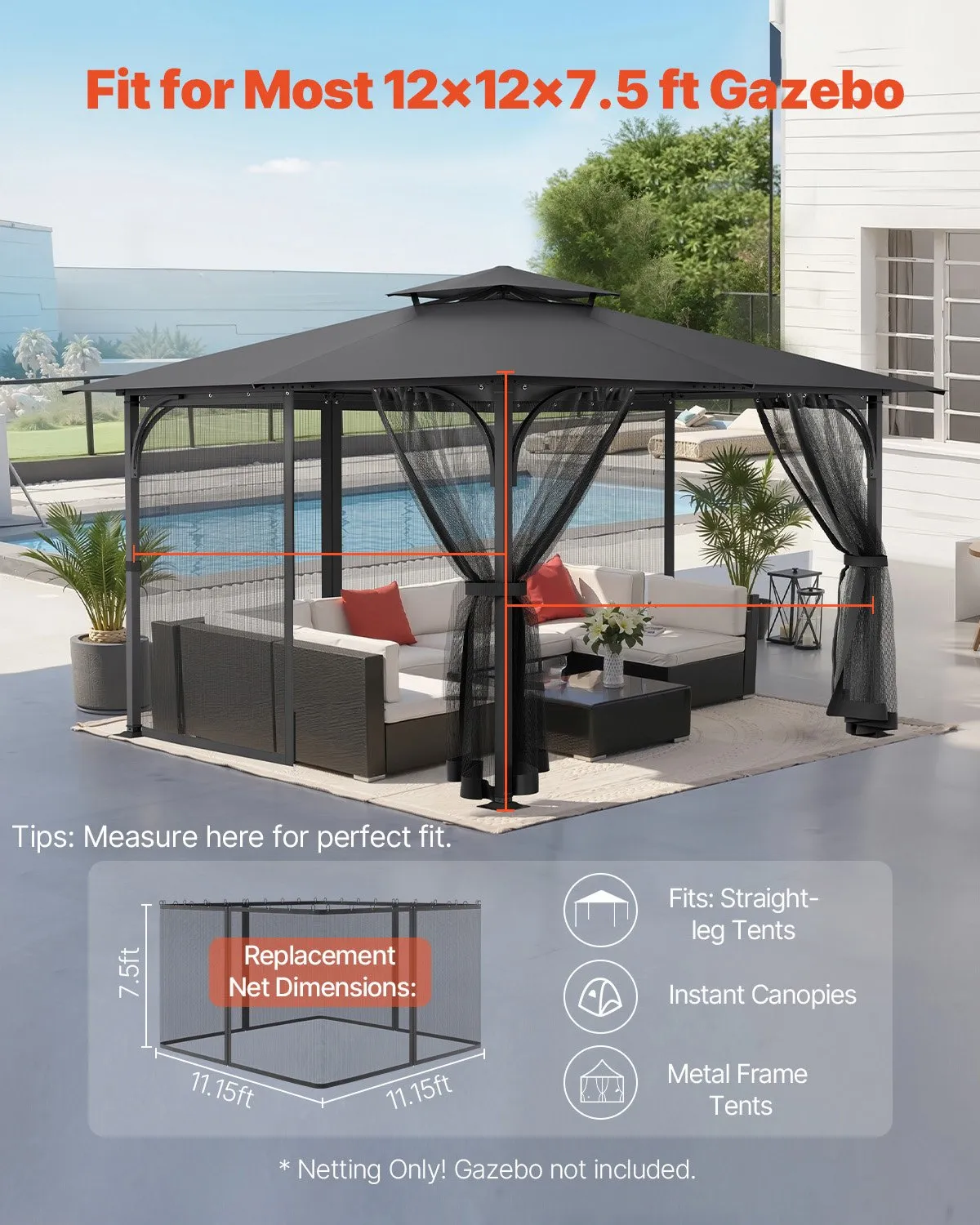 This replacement gazebo netting measures 11.15 (L) x 11.15 (W) x 7.41 (H) ft / 340 x 340 x 226 cm, and fits most rectangular or square gazebos with a post-to-post spacing of 11.48 ft (L) x 11.48 ft (W) / 350 x 350 cm, including straight-leg canopies, pop-up tents, pavilions, and wrought-iron tents. The net includes four zippered mesh side panels that cover all four sides of the gazebo.