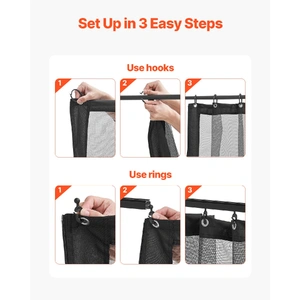 Each side features double-sided zippers for easy access. The mesh patio netting's edges are equipped with fastening straps at the top, middle, and bottom, with aluminum grommets for easy hanging and tear resistance. We provide both plastic hooks and hanging rings as mounting options, allowing you to choose the best method to secure the net to your gazebo.