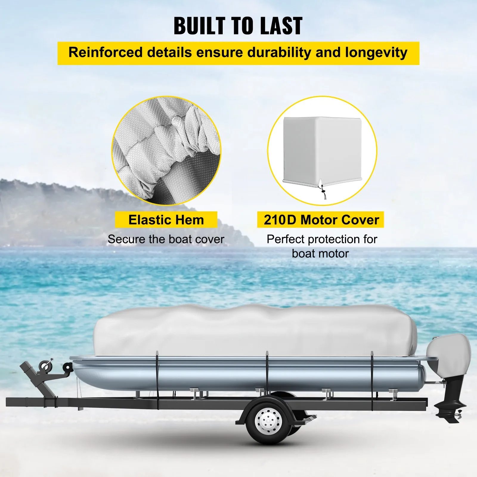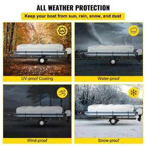 The pontoon boat cover features brilliant designs. The elastic hem gives a custom fit, better resisting strong wind. Our boat cover includes one portable bag for convenient storage and 2 support poles for propping up the boat cover and reducing water accumulation. These accessories perfectly complement your cover and keep it looking brand new for years to come.