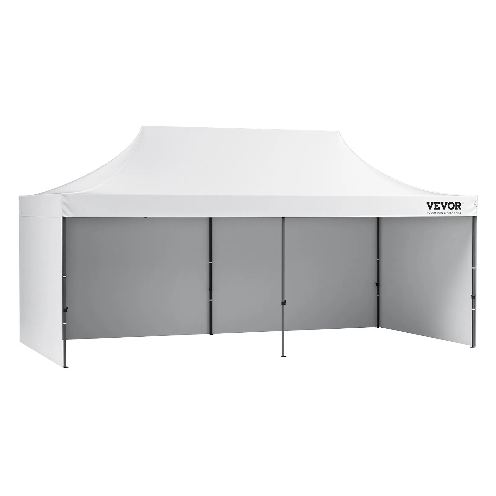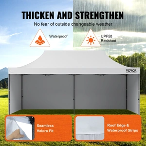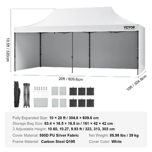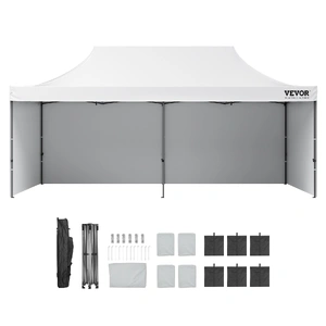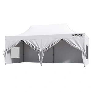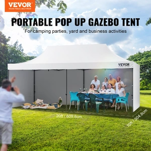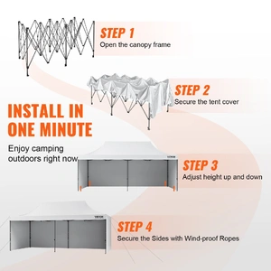 This 10x20 pop up canopy tent can be assembled in one minute, providing a temporary gathering place of 200 square feet. With three adjustable heights and a maximum internal height of over 9 ft, it offers a spacious standing room. This canopy with sidewalls comfortably accommodates 12-16 people, providing sun shade for a comfortable gathering.