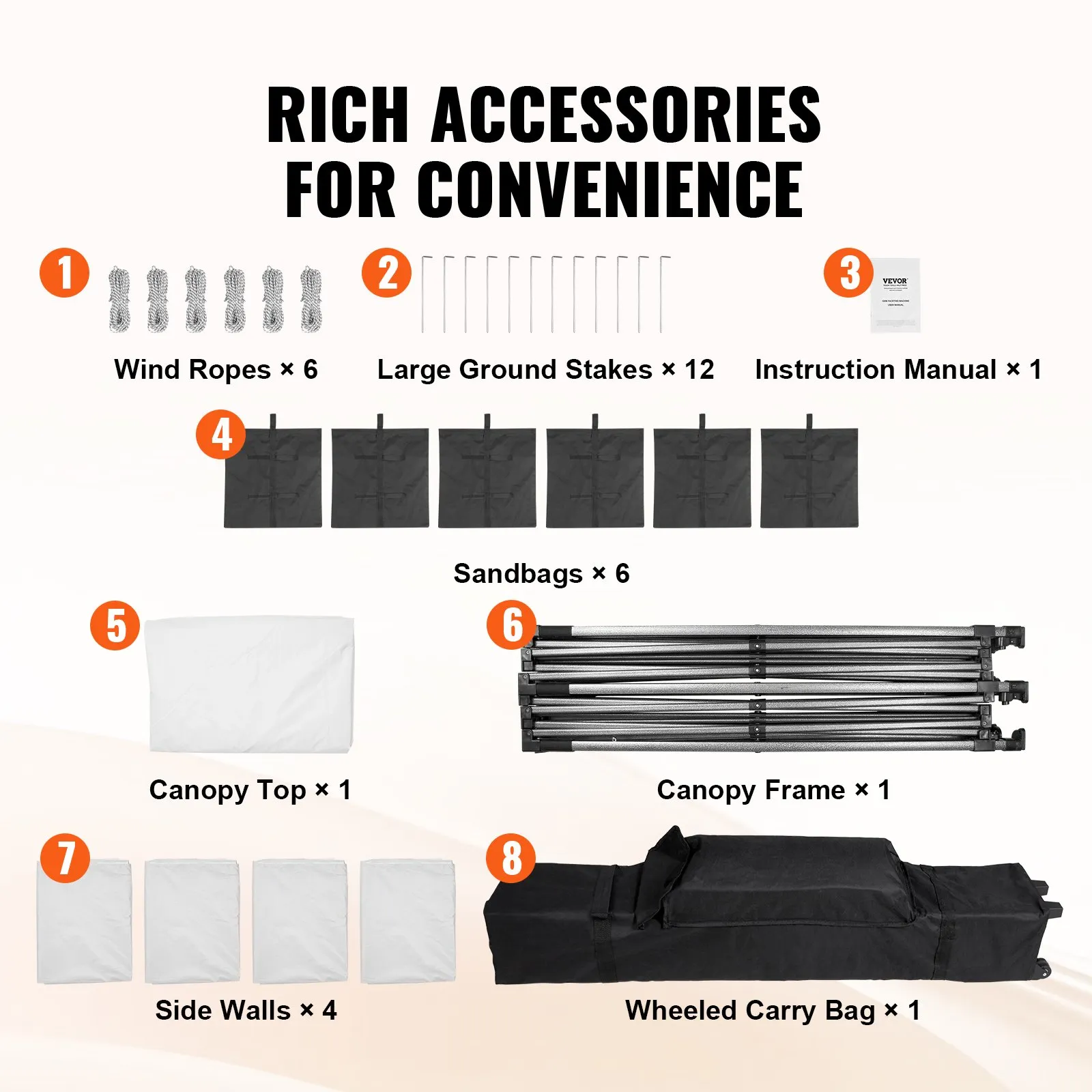 Easily carry and store this gazebo tent with its storage bag on wheels. The storage size is only 63.4x16.5x16.5 inches, fitting most vehicle trunks. The specialized accessory bag can hold 8 medium-sized ground nails and 4 ropes, ensuring that accessories are neatly stored and not easily lost.