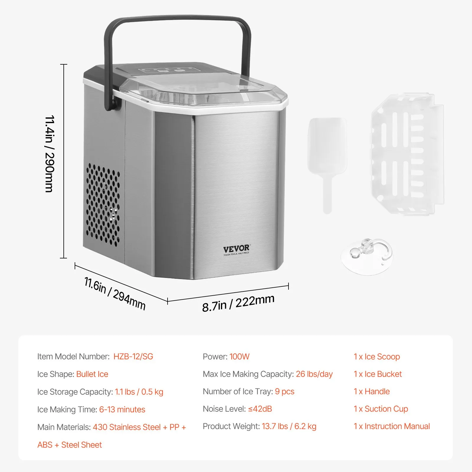 The countertop ice machine operates at a noise level lower than 42 dB, similar to the sound of a working refrigerator. The compact design includes a handle and measures 8.7 x 11.6 x 11.4 inches / 222 x 294 x 290 mm, making it suitable for use in rooms, offices, restaurants, and more.