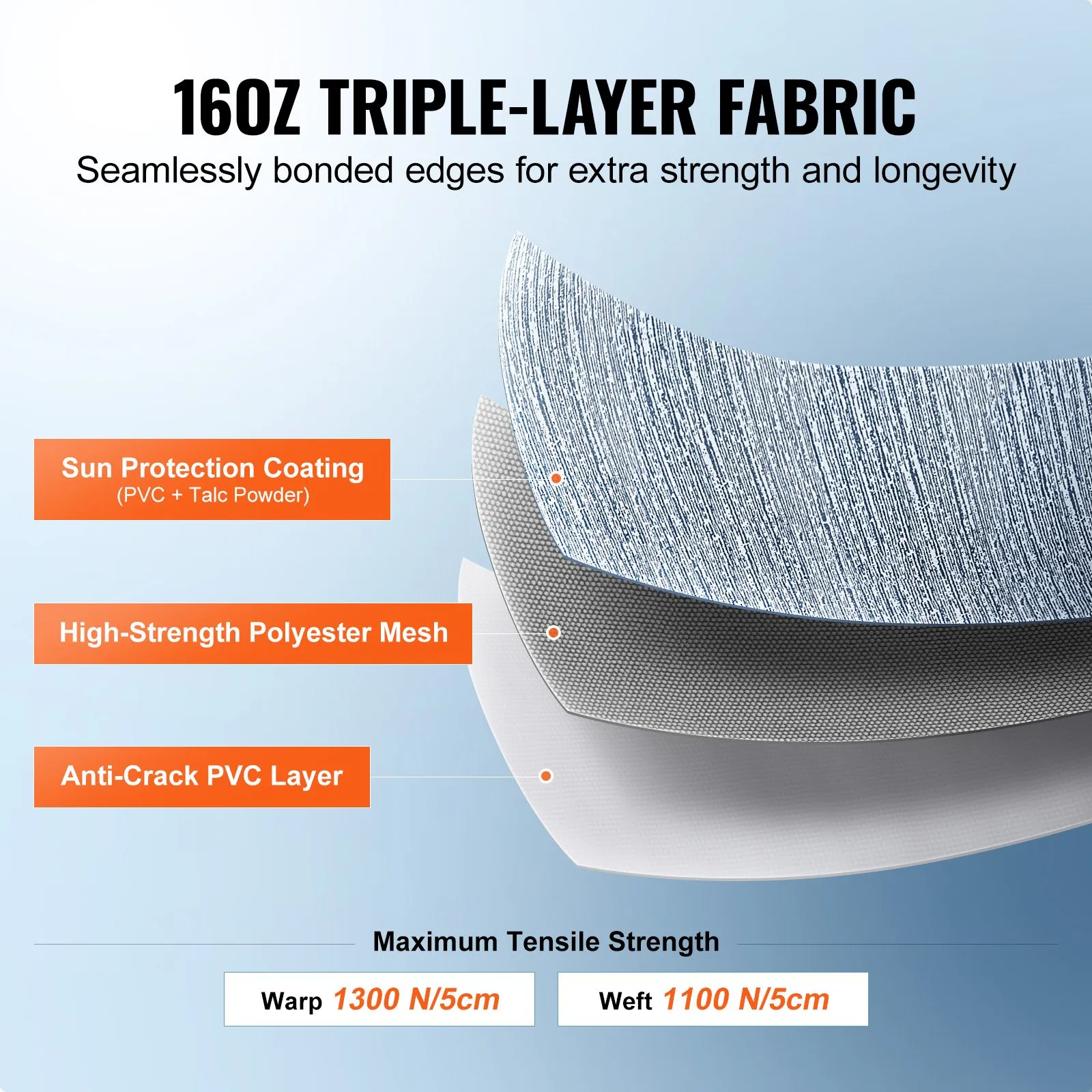 Constructed from a triple-layered PVC fabric, this RV awning fabric features an outer layer mixed with PVC and talc for sunscreen protection, a middle layer of high-strength polyester wire mesh for durability, and an inner PVC coating. This composition ensures resistance to fading, ease of cleaning, breathability, and mildew resistance. It's built to endure sunlight exposure, rain, and even washing machine cycles.