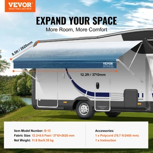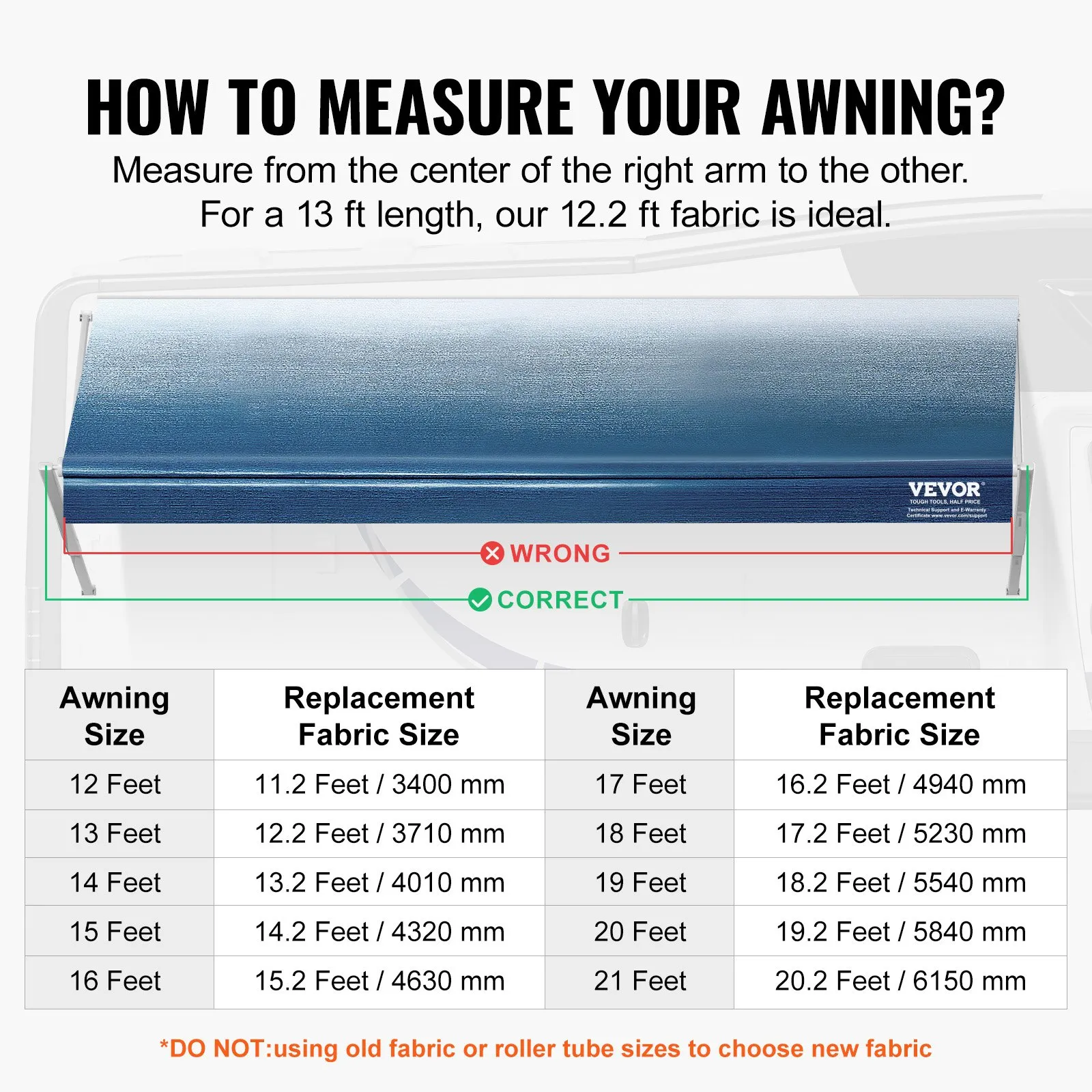 Our 12.2 ft length RV awning fabric replacement is designed for 13 ft RV awnings and is compatible with various RV awning types. To ensure a perfect fit, measure the distance from the center of the left support arm to the center of the right support arm on your RV roller before selecting your awning fabric size. Avoid using old fabric or roller sizes as a reference to prevent installation issues.