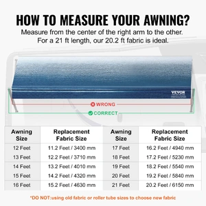 Our 20.2 ft length RV awning fabric replacement is designed for 21 ft RV awnings and is compatible with various RV awning types. To ensure a perfect fit, measure the distance from the center of the left support arm to the center of the right support arm on your RV roller before selecting your awning fabric size. Avoid using old fabric or roller sizes as a reference to prevent installation issues.
