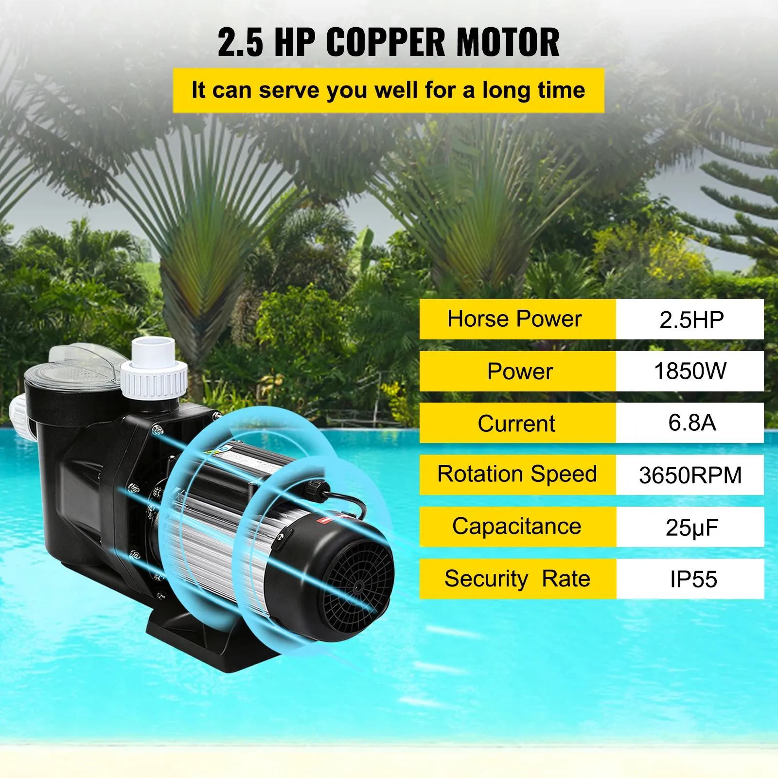 The swimming pool pump is equipped with a pure copper motor for high efficiency, low noise, and long service time. The pool pump power: 1850W/2.5 HP, capacitance: 25 F, Amps: 16 A, voltage: 240V/50Hz, security rating: IP55.