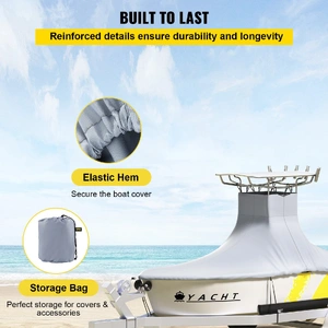 The T-Top center console boat cover features brilliant designs. The elastic bottom hem provides an adjustable snug fit and protects the cover from blowing off. Our t-top boat cover includes one portable bag for convenient storage and 2 support poles for propping up the boat cover and reducing water accumulation.