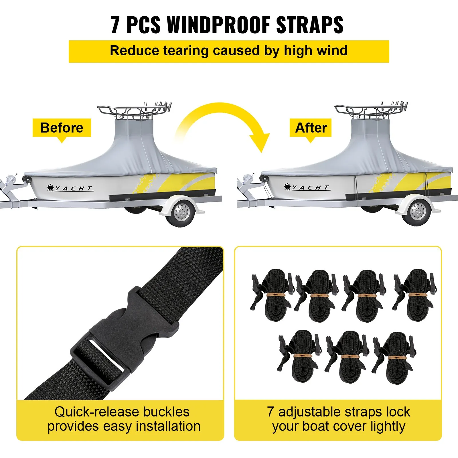 The T-Top cover is equipped with quick-release buckles, so you can quickly and easily complete installation. 7 adjustable straps will lock your boat cover tightly, protecting the boat cover from blowing off in the heavy wind.