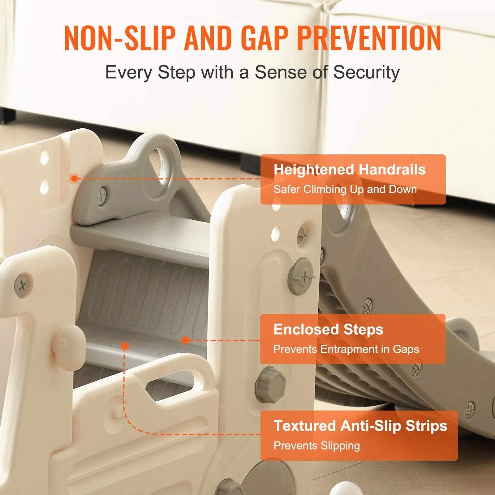 Closed steps prevent hands and feet from getting stuck in the gap, raised handrails ensure greater peace of mind, and embossed anti-slip strips provide extra grip for children to avoid slipping.