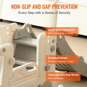 4.4ft / 1.34m slide extends playtime, three-stage design from acceleration to deceleration to cushioning, slide side panels protect children from falling while sliding, ensuring secure entertainment.