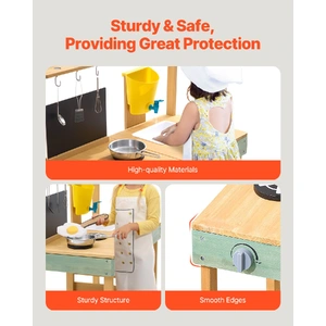 The outdoor mud kitchen features a waterproof and corrosion-resistant surface, treated with outdoor-grade paint. It is built to withstand harsh weather and extreme conditions, making it perfect for outdoor use in gardens, backyards, or lawns. This kids grocery store playset market can easily handle rain and intense sunlight, ensuring durability and extending its lifespan
