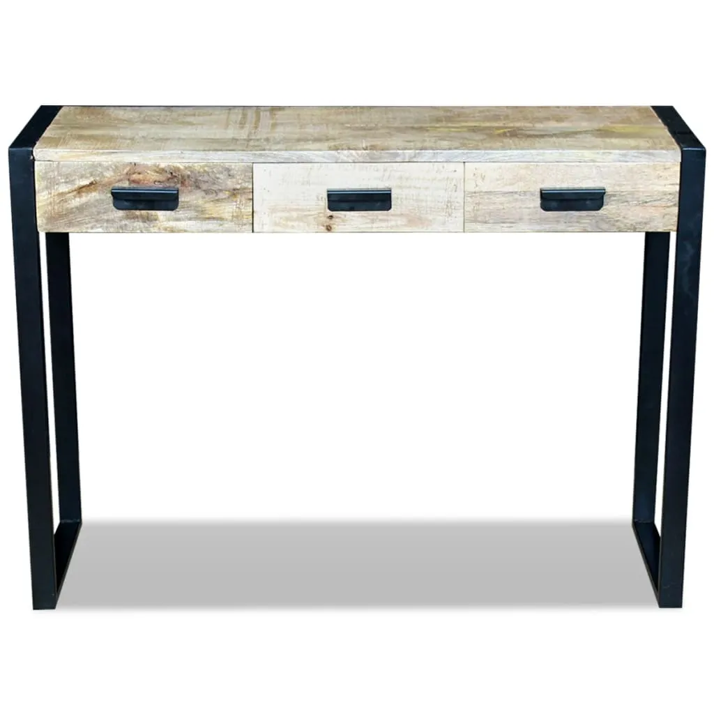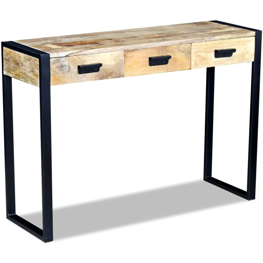 This industrial-style wooden console table will make a distinctive addition to any room. It can also be used as a sideboard, high cabinet, side table, high board, drawer cabinet, etc. Its solid mango wood top provides ample space to display decorative objects, photo frames, or even potted plants, while you can keep small items like keys, notepads, pens, and other knick-knacks in its three spacious drawers. Its iron box legs add to its sturdiness and stunning industrial style. The visible grain structure makes every piece of furniture unique and slightly different from the next. The console table is fully handmade, and the craftsmanship adds to its spectacular retro style. Every step of the process is carried out with the greatest care, be it polishing, painting or lacquering. Important note: Colours vary from piece to piece, making each of our console tables unique. The delivery is random, ensuring the exclusivity and individuality of your product.