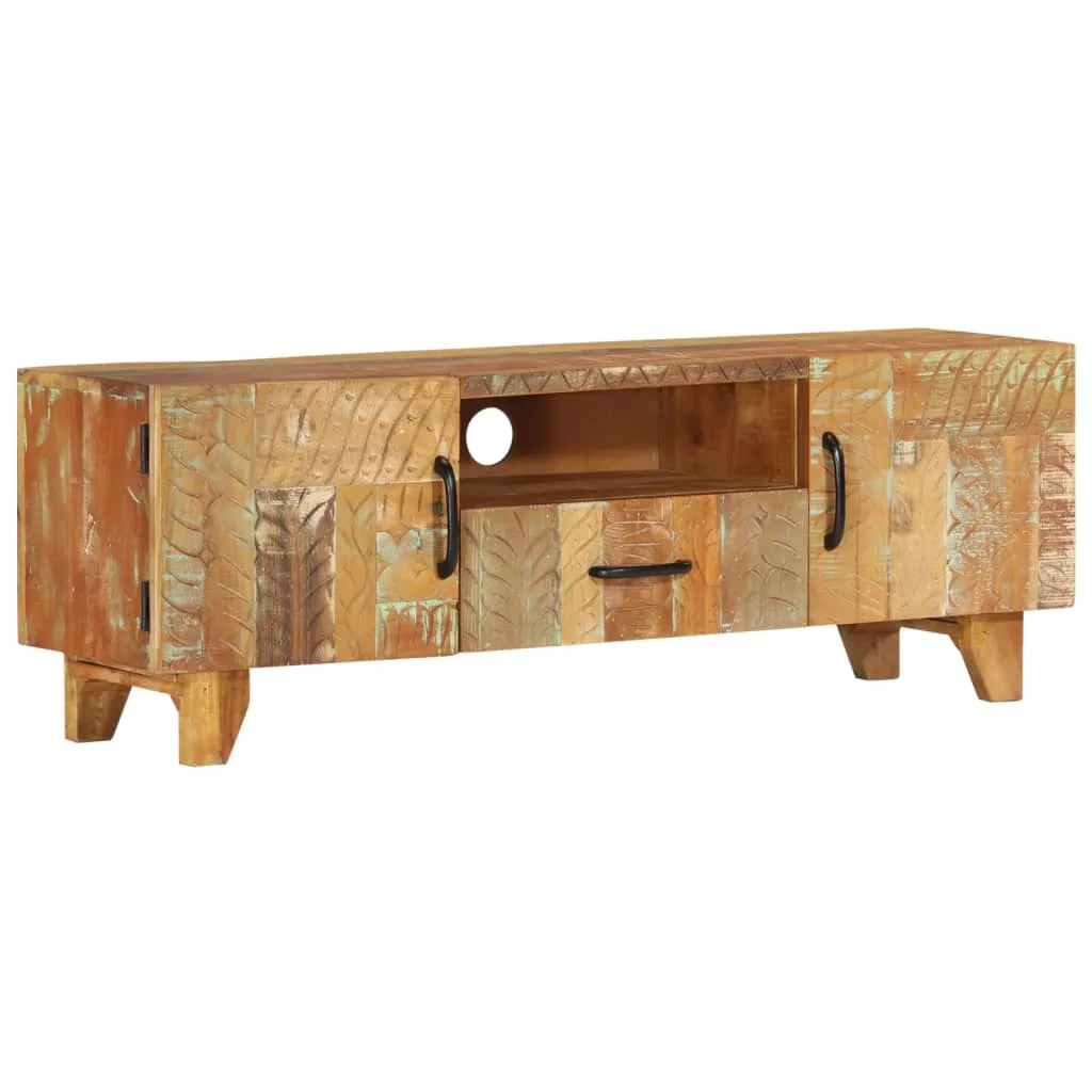 Bring the luxury of mid-century inspired design to your interior with our stylish solid wooden TV cabinet! This colourful HiFi cabinet with antique hand carved pattern is made of solid reclaimed wood that has been sourced from joists, floors and support beams from old buildings being demolished, and it can consist of different types of wood like pine, teak, beech, oak, cedar, mango wood, acacia, etc. This means the reclaimed wood retains the characteristics of these different types of wood. Reclaimed wood is already aged, weathered and dried, so it doesn't shrink or bend. Every step of the process is carried out with the greatest care, be it painting, polishing or lacquering. The exquisite craftsmanship and the graceful wood grains make every piece of furniture distinctive and slightly different from the next. Additionally, this vintage plasma cabinet is distinguished by 2 doors, 1 drawer and 1 compartment, offering an ideal solution for keeping your smaller items organised and within reach. The lowborad is easy to assemble. Important note: Colours and wood grains vary from piece to piece, making each of our TV cabinet unique. The delivery is random, ensuring the exclusivity and individuality of your product.