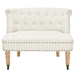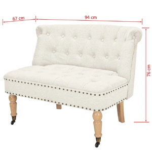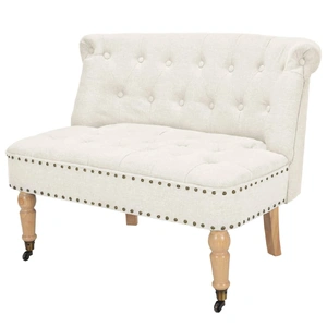 This elegantly designed loveseat will make a great addition to your home decor. It features a comfortable, thickly-padded fabric upholstery and a sturdy, high-quality wooden frame with stable rubberwood legs. The front legs are equipped with wheels, so you can easily move the loveseat. Assembly is easy.