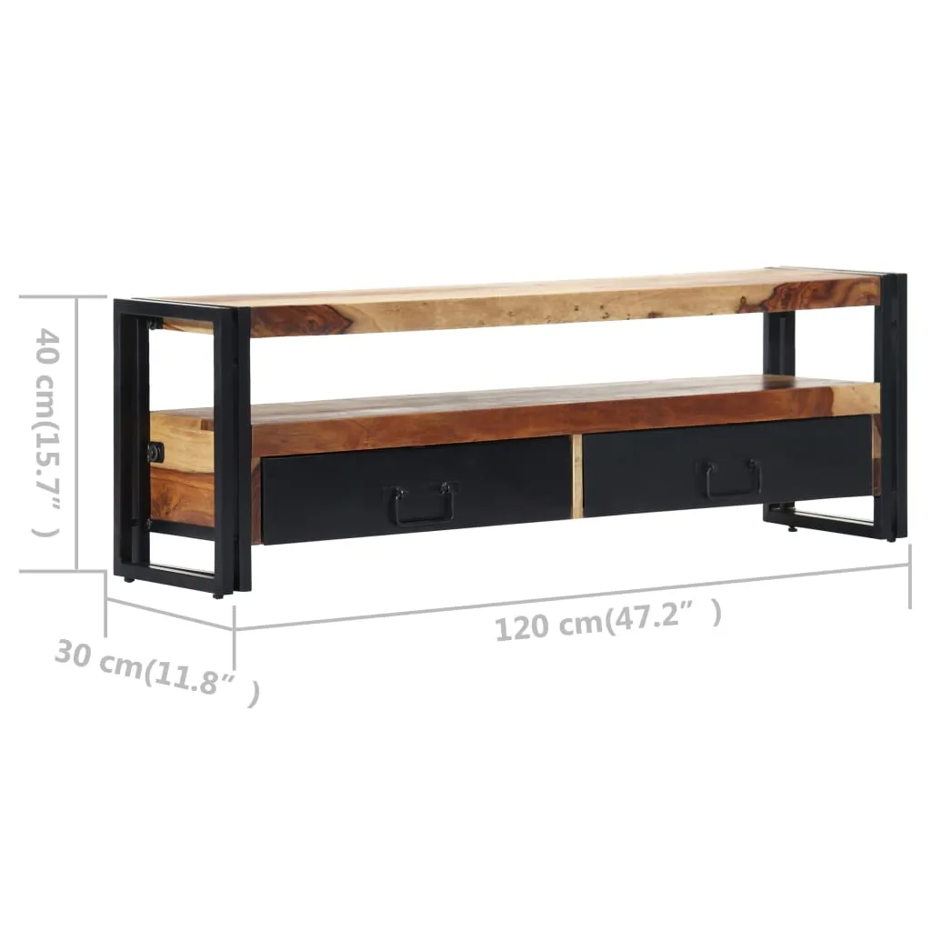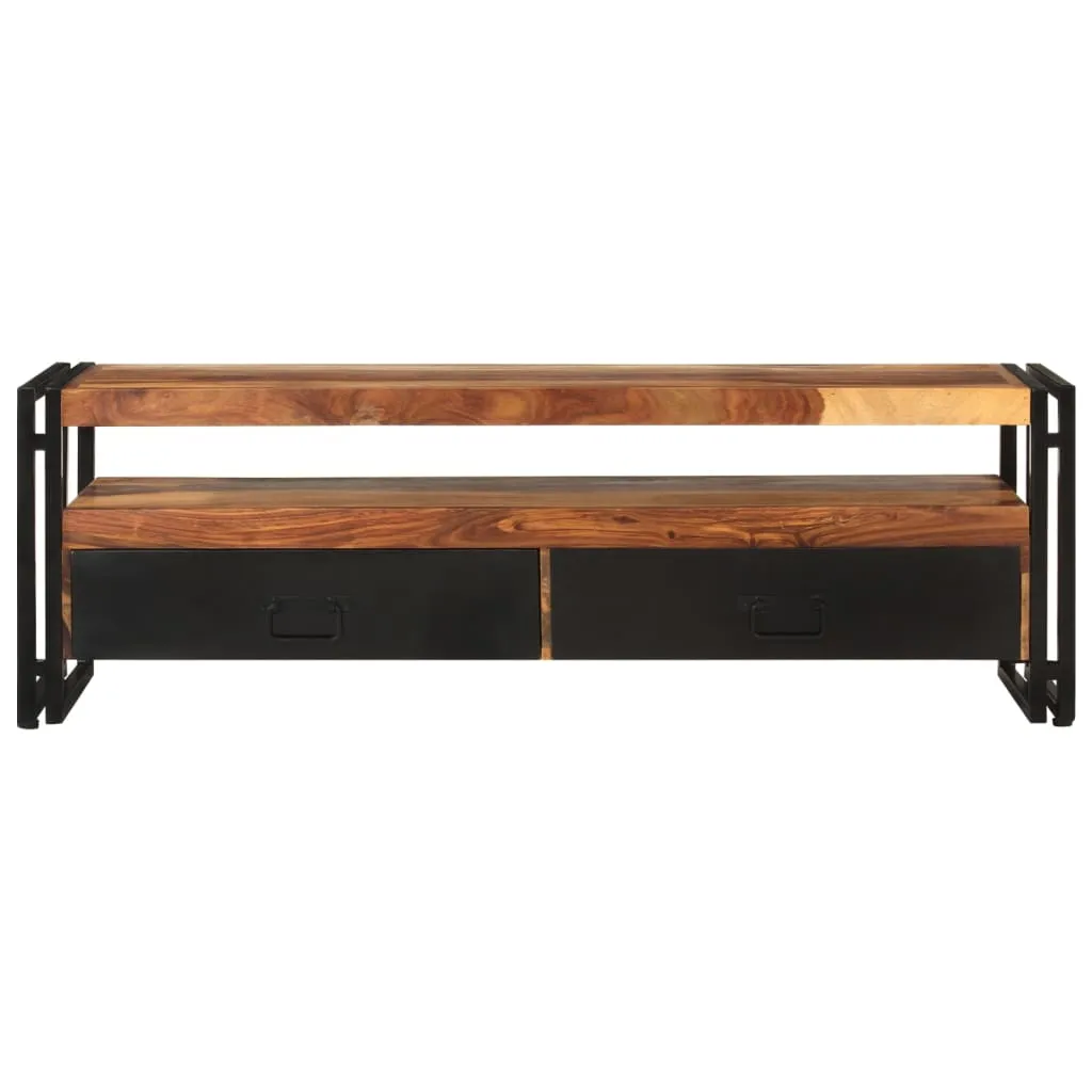 Featuring a trendy yet practical design, this solid Sheesham wood TV cabinet will definitely become a focal point of your room. This modernTV cabinet, made of solid Sheesham wood, will make a timeless addition to your home. Sheesham is a tropical hardwood that is famous for its rich grains and also known as rosewood or palisander. Every step of the process is carried out with the greatest care, be it polishing, painting or lacquering. Thanks to the strong steel frame, the TV stand is exceedingly sturdy and durable. It has 2 drawers and 1 open compartment for storing knick-knacks and keeping multimedia appliances, gaming consoles and magazines. Important note: Colours vary from piece to piece, making each of our TV cabinets unique. The delivery is random, ensuring the exclusivity and individuality of your product.