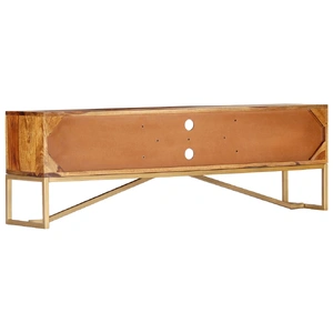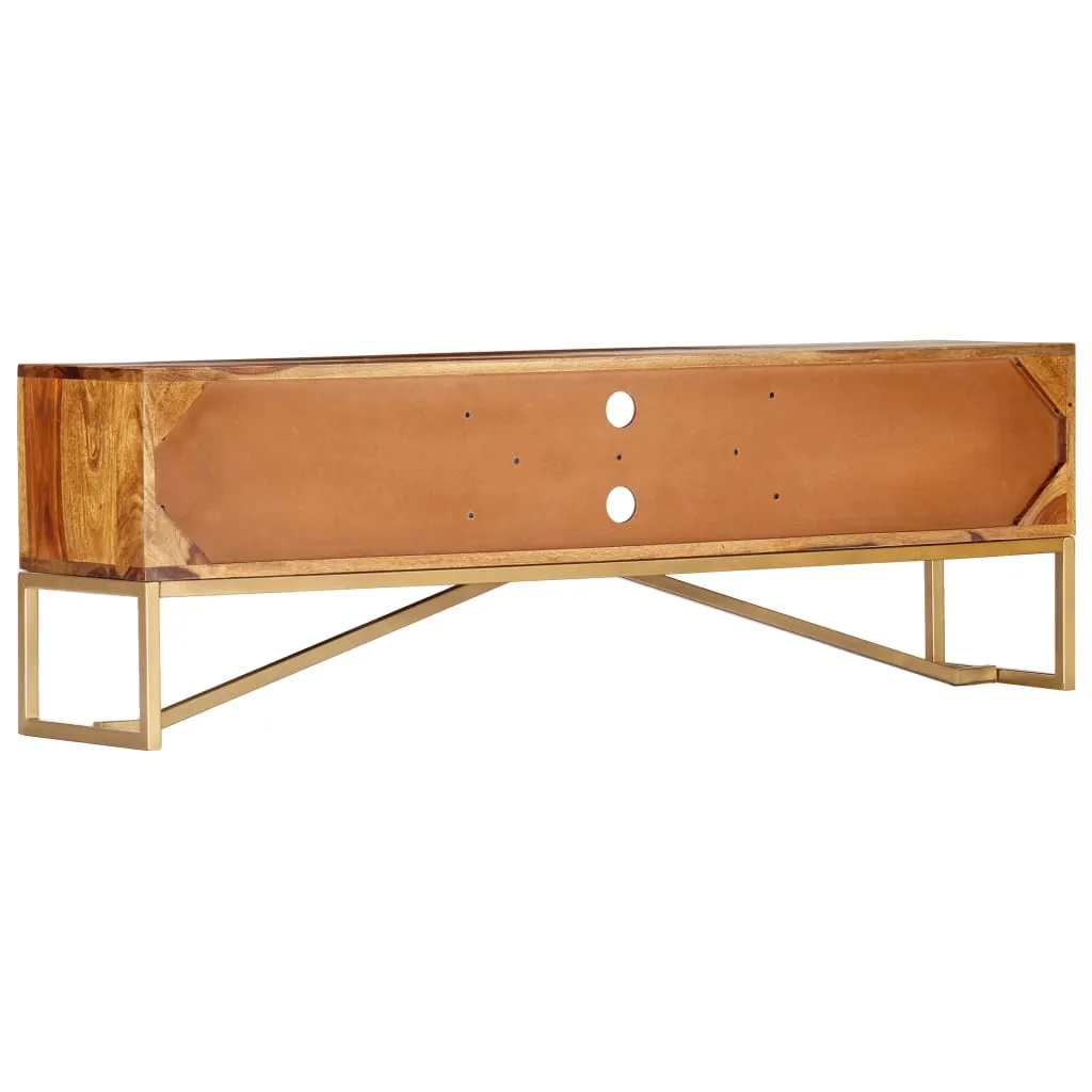 Bring the luxury of mid-century inspired design into your home with this solid sheesham wood TV cabinet! It will make a timeless addition to your living room or entertainment area. The HiFi cabinet is made of solid sheesham wood. Sheesham, also known as rosewood or palisander, is a tropical hardwood famous for its rich grain. The beautiful wood grains make each of our lowboard unique and slightly different from the others. This stereo cabinet is supported by sturdy metal feet which also adds an aesthetic appeal. Additionally, this plasma cabinet has 2 drawers, 2 shelves and 1 compartment, providing ample space for storing your DVD player, game console, media carriers, etc, while its strong brass powder-coated iron legs contribute to the sturdy construction. Important note: The colours vary from piece to piece, making each of our wooden cabinet unique. The delivery is random, ensuring the exclusivity and individuality of your product.