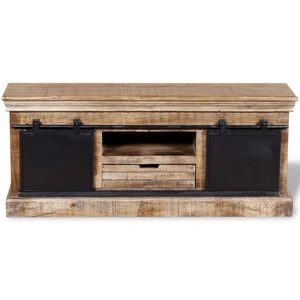 This quirky, industrial wooden TV cabinet is very practical and has ample storage space. It can also be used as a sideboard, low board, side cabinet, etc. It will make a unique decorative addition to your living room or bedroom. This TV cabinet is made of solid mango wood, which means that this piece of furniture is sturdy, stable and durable. Its shelves have room for placing your multimedia appliances, magazines, etc. The cabinet also has two compartments, each with a sliding door providing plenty of room for organising your CDs, magazines. The iron sliding door design adds to its sturdiness and makes this cabinet really stunning and unique. The visible grains make every piece of furniture unique and slightly different from the next. The TV cabinet is fully handmade, and the craftsmanship adds to its spectacular retro style. Every step of the process is carried out with the greatest care, be it polishing or lacquering. Important note: Colours vary from piece to piece, making each of our TV cabinets unique. The delivery is random, ensuring the exclusivity and individuality of your product.