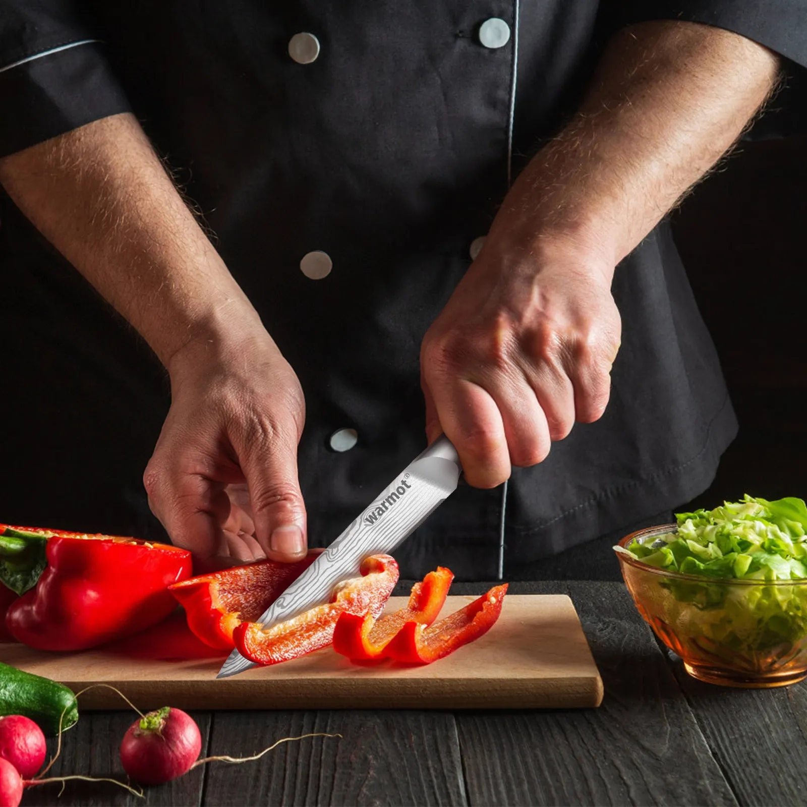 warmot kitchen knifef set: 1x 8 chef knife, 1 x 5 utility knife, 1 x 3.5 paring knife, can meet the daily needs of the family such as cutting meat, vegetables,cutting fruit, peeling and other sharp operationsHowever, do not use for cutting hard objects.
