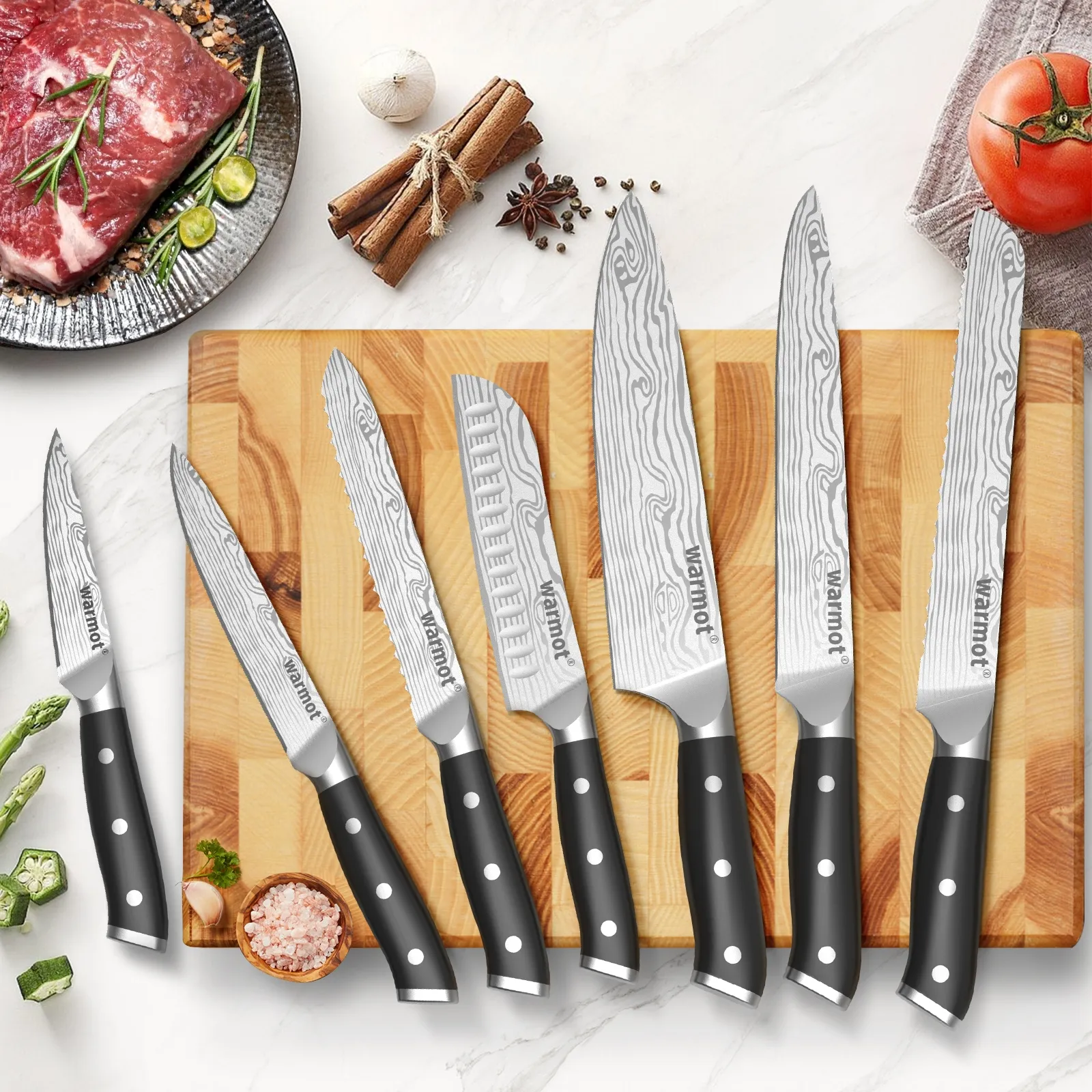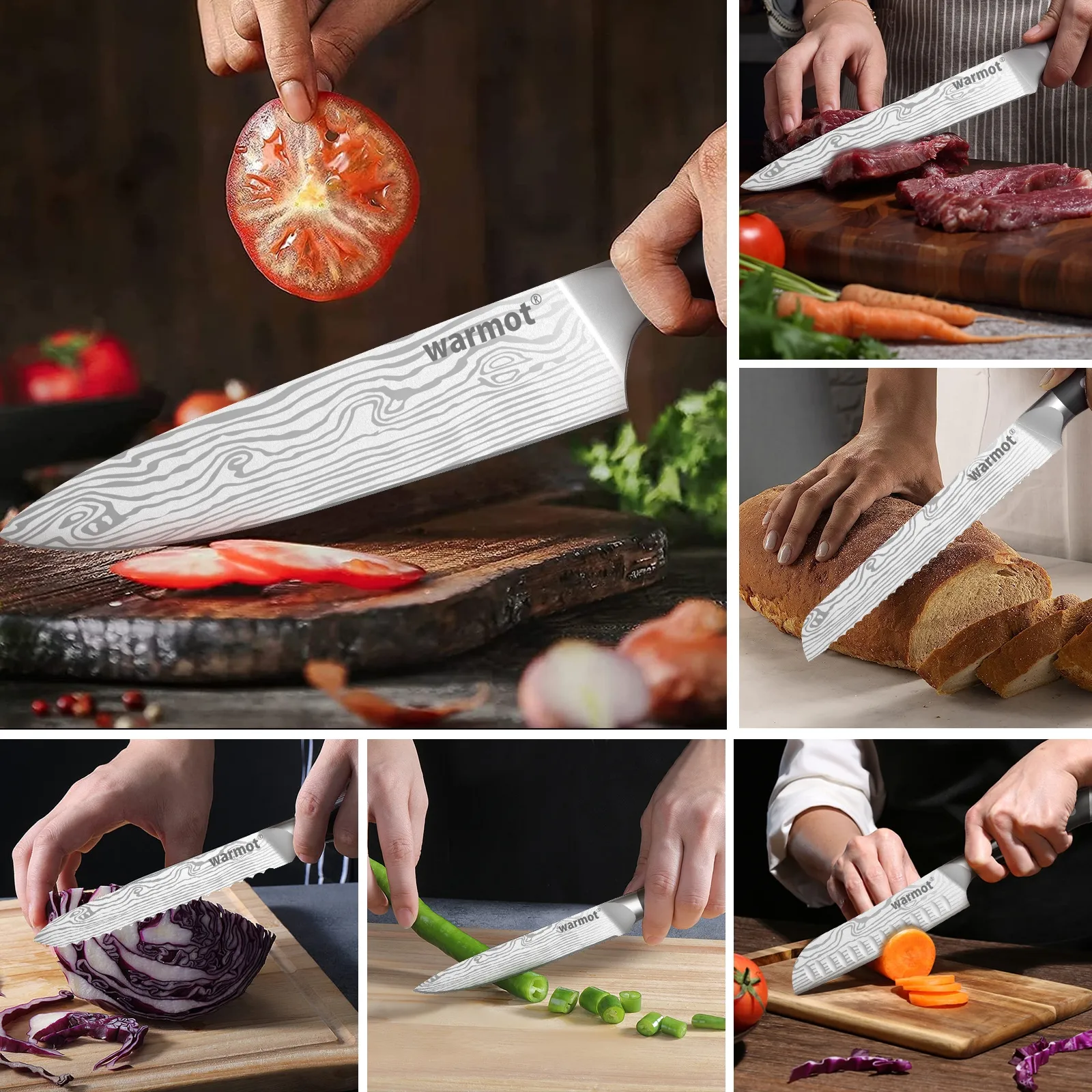 Warmot kitchen knifef set: 1x 8 chef knife, 1 x 8 slicing knife, 1 x 8 bread knife, 1 x 5 santoku knife, 1 x 5.5 serrated utility knife, 1 x 5 utility knife, 1 x 3.5 paring knife, can meet the daily needs of the family such as cutting meat, vegetables,cutting fruit, peeling and other sharp operationsHowever, do not use for cutting hard objects.