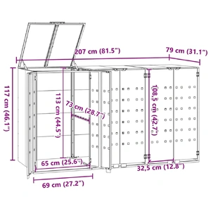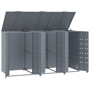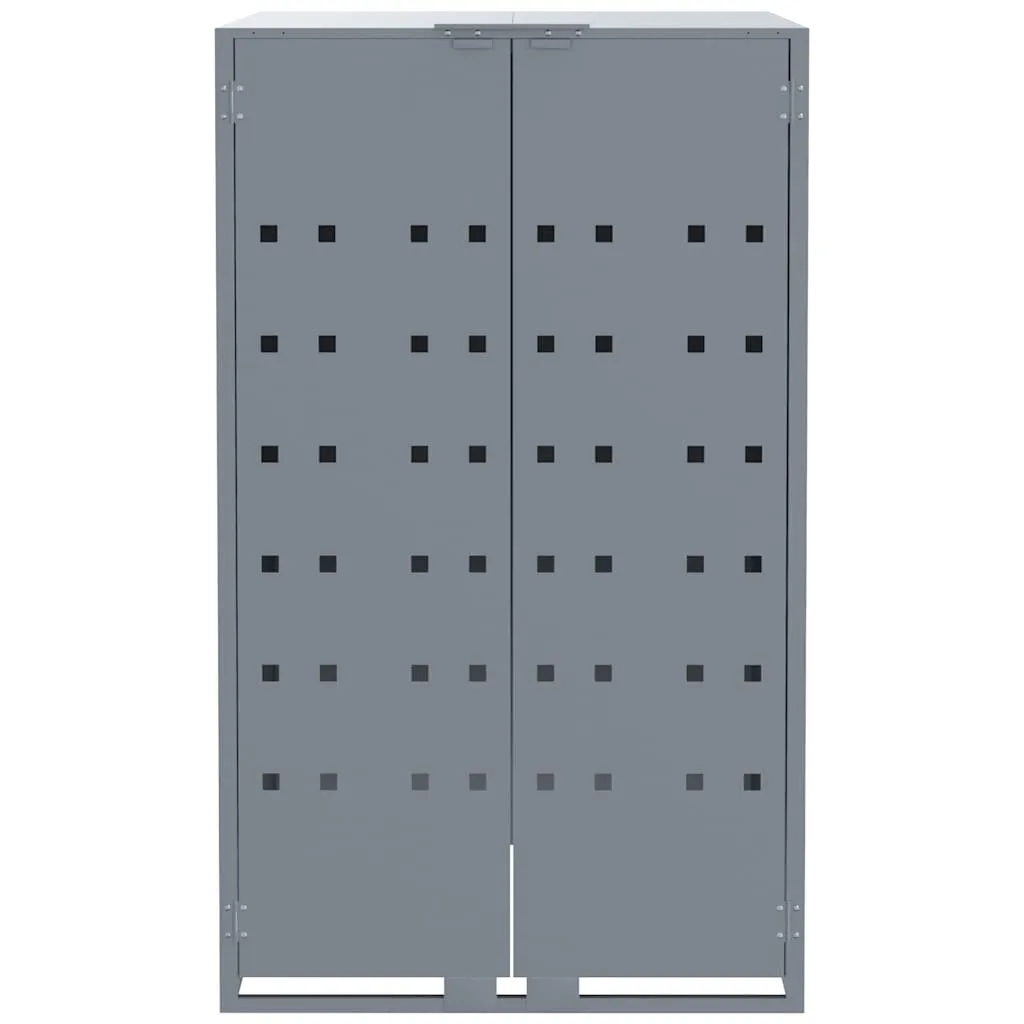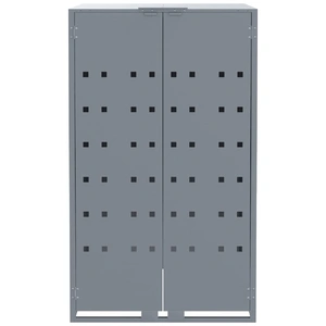 This wheelie bin storage discreetly hides your garbage bins in the garden, transforming your outdoor space into a beautiful and tidy environment. Strong and durable material: The powder-coated steel provides strength, stability, durability, and resistance to corrosion and harsh weather conditions, ensuring long-lasting performance.Practical lid mechanism: The gas-spring lid comes with a bungee cord that connects your bin's lid to it, so the bin lid opens automatically when you lift the lid of the bin store.Easy access: The front doors with magnetic closures make it a breeze to remove and replace the bins, ensuring waste disposal is effortless.Good ventilation: These vents on the panels promote air circulation, preventing odour buildup and keeping your bins fresh.Flexible design: You can enlarge your bin shed to accommodate more bins by adding extra extensions. These extensions are available for individual purchase at the store.