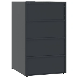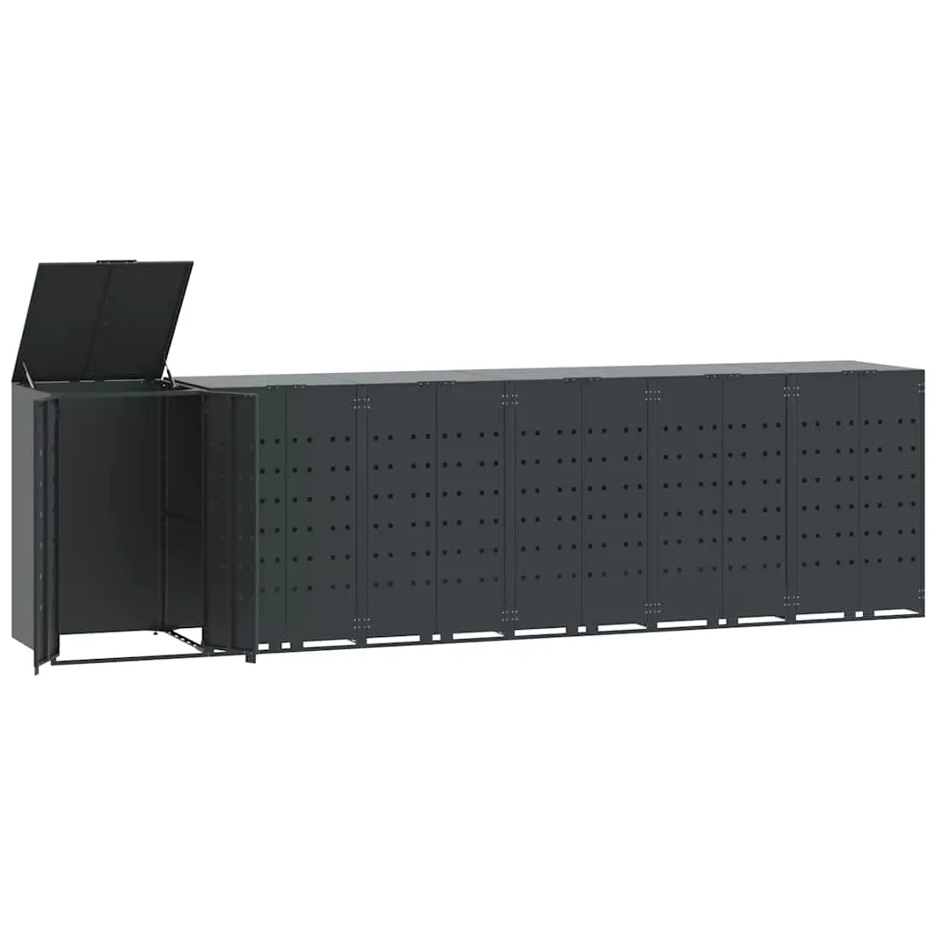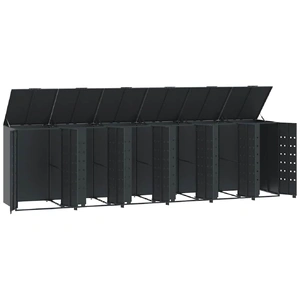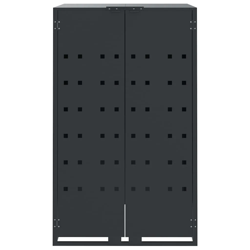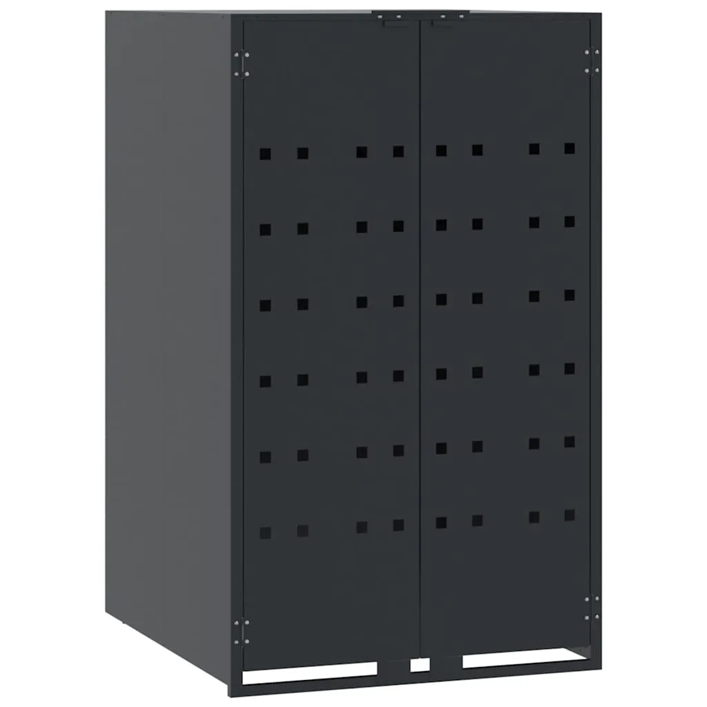 This wheelie bin storage discreetly hides your garbage bins in the garden, transforming your outdoor space into a beautiful and tidy environment. Strong and durable material: The powder-coated steel provides strength, stability, durability, and resistance to corrosion and harsh weather conditions, ensuring long-lasting performance.Practical lid mechanism: The gas-spring lid comes with a bungee cord that connects your bin's lid to it, so the bin lid opens automatically when you lift the lid of the bin store.Easy access: The front doors with magnetic closures make it a breeze to remove and replace the bins, ensuring waste disposal is effortless.Good ventilation: These vents on the panels promote air circulation, preventing odour buildup and keeping your bins fresh.Flexible design: You can enlarge your bin shed to accommodate more bins by adding extra extensions. These extensions are available for individual purchase at the store.