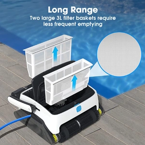 With a tangle-free 15 metre cable and dual upgraded larger filter volumes (3L each), the Grampus 800 can easily navigate your pool and collect all kinds of debris. The easy-to-remove and rinse filters ensure hassle-free maintenance.