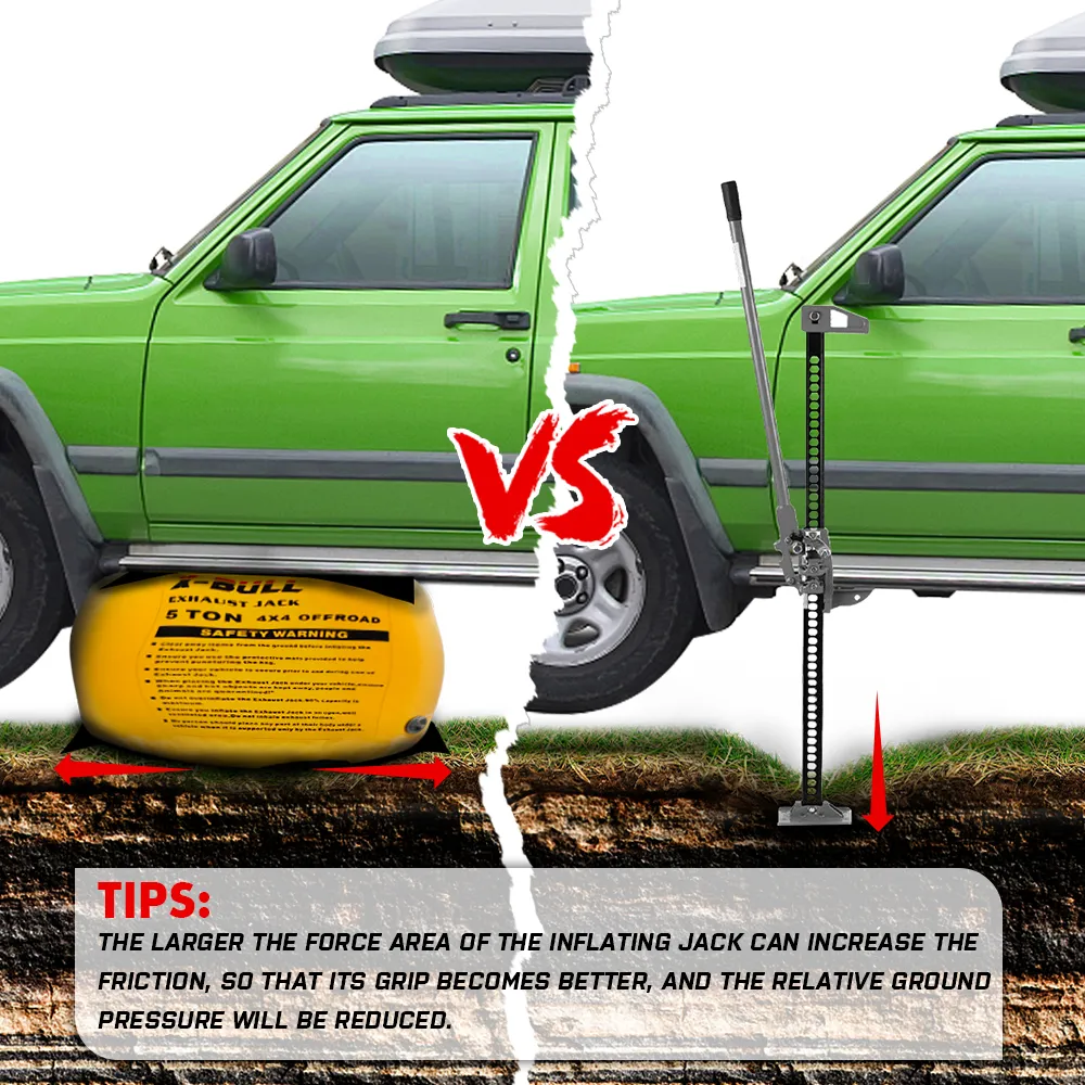 [Unique role] The exhaust jack can be used on hard ground and special terrain such as sand, mud and snow. Air jack can lift up to 5000kg of vehicles, which is equivalent to the weight of a truck. Therefore, the jacks can be applied to most car.