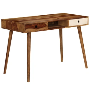 This Sheesham wood writing desk is stylish and practical. The elegant design will make this writing desk a focal point of any room. This wooden writing desk has a sturdy top. Its 3 large compartments offer you extra storage space for books, snacks, and other private belongings. This study desk is made of solid Sheesham wood. Sheesham is a tropical hardwood that is famous for its rich grains and also known as rosewood or palisander. Its beautiful wood grains make every piece of furniture unique and slightly different from each other. The strong wooden legs contribute to the sturdy construction. Our desk is easy to assemble. Important note: Colours vary from piece to piece, making each piece unique. The delivery is random, ensuring the exclusivity and individuality of your product.